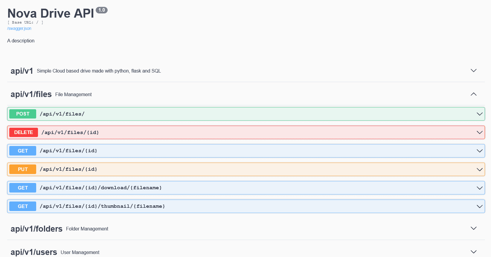 Nova Drive is made in Python. The REST API is developed using Flask, a lightweight framework to handle the construction of HTTP-based apps. To make the method definition a little more structured inside the code, the library Flask-restx is used. This library is a Flask wrapper that comes with handy functionalities and a structure to define REST methods.